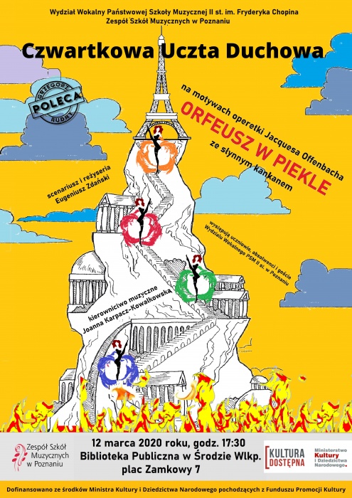 Biblioteka Publiczna zaprasza na kolejny koncert z cyklu: Czwartkowa Uczta Duchowa, który odbędzie się 12 marca o godz. 17.30 w sali BP. Będzie to wyjątkowe wydarzenie, po raz pierwszy w Bibliotece do obejrzenia i usłyszenia będzie "Orfeusz w piekle" na podstawie operetki Jacquesa Offenbacha. Lista aktualności #koncerty